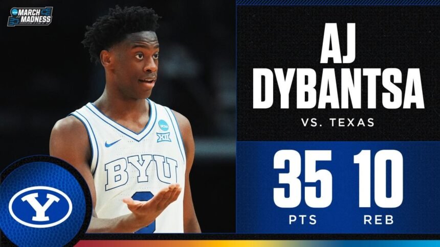 AJ Dybantsa had a strong opening game in March Madness for BYU with 35 points and ten rebounds in a 79-71 loss against Texas in the first round of the 2026 NCAA men’s basketball tournament.