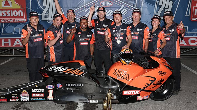 BREA, CA – November 3, 2025 – (Motor Sports NewsWire) – Gaige Herrera kept his hopes of winning a third straight Pro Stock Motorcycle championship alive by racing his RevZilla/Motul/Vance & Hines Suzuki Gen 3 Hayabusa to his seventh victory of the season at the Dodge NHRA Nevada Nationals powered by Direct Connection at The Strip at Las Vegas Motor Speedway in Las Vegas, NV, on Sunday.