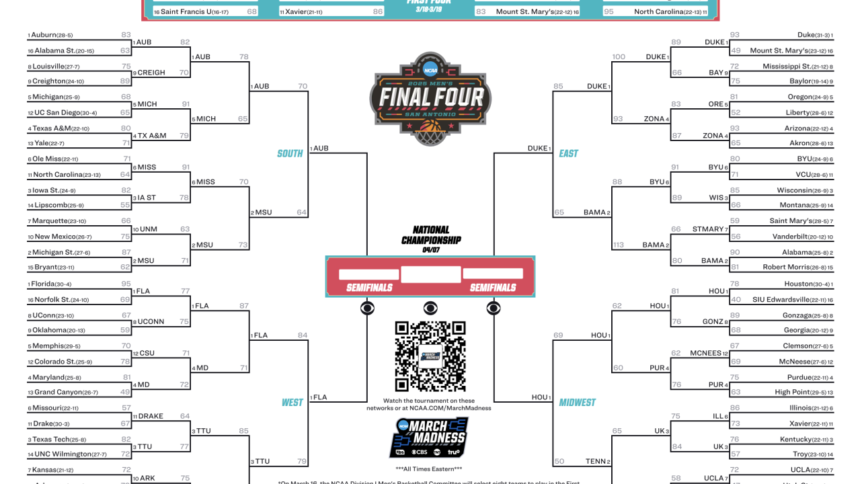 Here is the official, printable 2025 NCAA tournament bracket for March Madness and the DI men’s basketball tournament. You can find the bracket, schedule, scores and game times below.