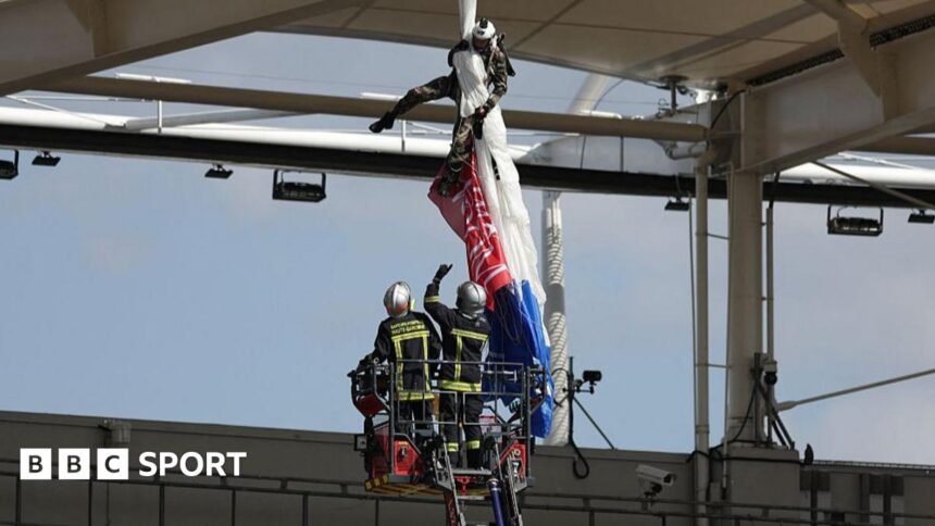 Stadium staff and Toulouse’s mascot lion gathered post protectors to place underneath the parachutist and a large children’s inflatable was brought in from outside the stadium to provide further cushioning.