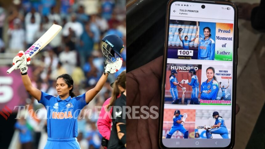 Later, he whips out his mobile phone and shows the reason for his delay: he had to visit the local printer to give orders for some banners to display at venues that he planned to visit during the tournament. One of those read: ‘100* – Pratika Rawal: Proud Moment of Father.’