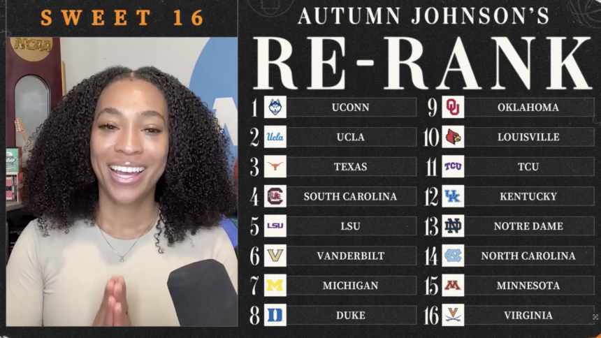 Autumn Johnson re-ranks the teams in the Sweet 16 of the 2026 NCAA women’s basketball March Madness tournament before the Elite Eight.