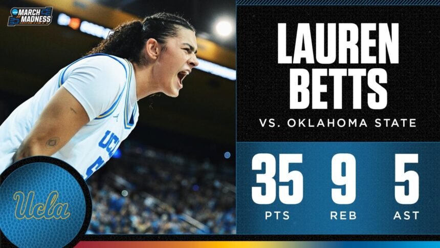 Lauren Betts led UCLA to a dominant second round victory over Oklahoma State, putting up a career-high 35 points, 9 rebounds, and 5 assists. Watch her full game highlights.